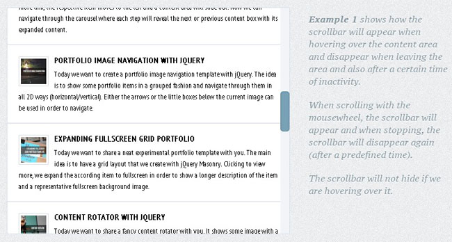 jquery隐藏滚动条是一款基于jquery+CSS3实现的隐藏滚动条悬停效果。