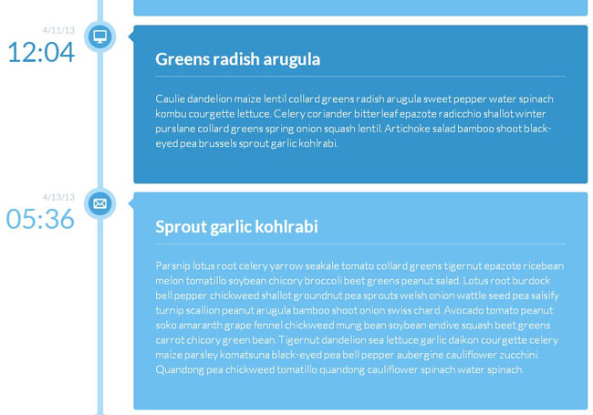 css3垂直时间轴是一款基于响应式图标时间轴颜色交替排序列表效果。