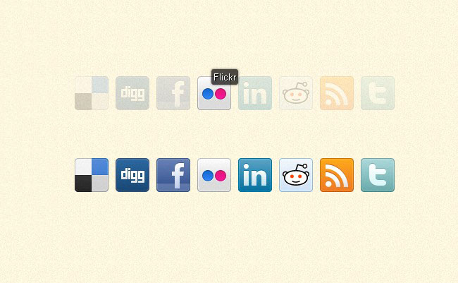 jQuery社交网站图标展示是一款通过CSS3和jQuery分别制作漂亮的社交网站图片动态展示效果,鼠标滑过其中一个社交网站图标,图标突出显示,其它图标变暗。