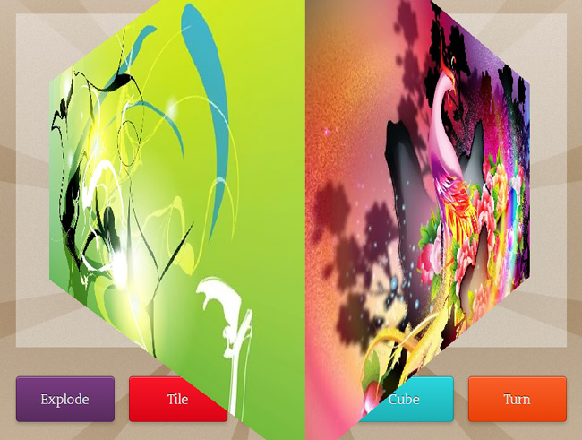 5款不同的图片3D切换特效是一款基于jquery+css3+html5实现的超酷的3D图片切换代码。