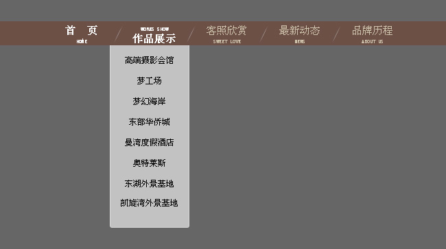 jQuery双语切换下拉导航是一款婚纱摄影网站的双语切换下拉导航代码,鼠标经过一级栏目,主导航双语文字切换,并下拉出二级栏目。