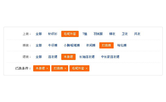 jQuery淘宝商品列表多条件查询是一款仿淘宝购物的商品列表页面多条件查询筛选商品种类特效代码。