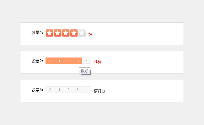 jQuery鼠标星级打分特效是一款带有三种打分效果,实用简单代码非常少便于修改。