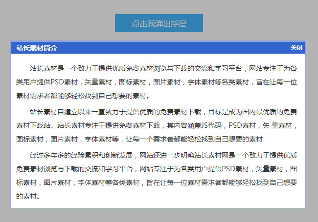 jQuery从页面右上角弹出的浮层代码是一款基于jquery实现的鼠标点击从页面右上角弹出的浮层代码,代码很简单,效果很实用!