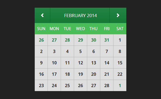 国外网站抠下来的jquery日历是一款绿色风格的jquery日历特效,点击左右箭头可查看相应的日期。