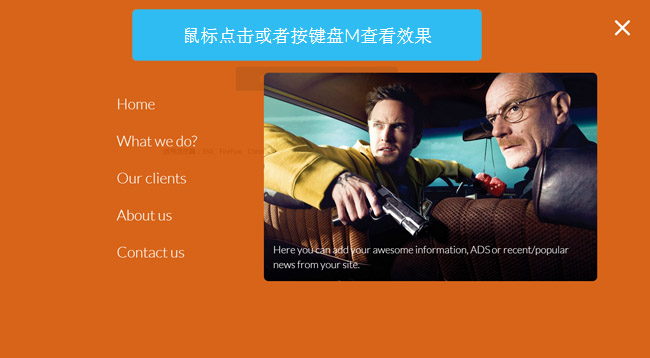jQuery右侧弹出全屏覆盖菜单是一款鼠标点击相关按钮或者按键盘的M键弹出全屏遮罩效果的菜单。