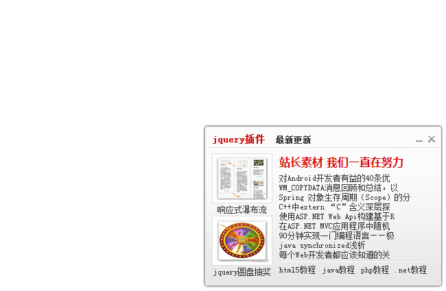 js右下角悬浮提示框是一款非常实用的js特效,实现右下角悬浮可大化、小化和关闭功能的提示框,应用范围很广,可当做网站的消息提示功能,也可以当成网站的右下角悬浮广告功能。