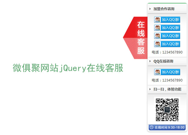 微俱聚网站jQuery在线客服代码是一款来自微俱聚平台发的带有微信二维码的jquery在线客服。
