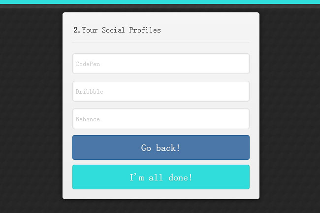 CSS3个人资料填写表单是一款个人资料填写表单,我们可以分两步来填写个人资料,每一步的切换都有淡入淡出的动画效果,你也可以回退到上一步继续填写。