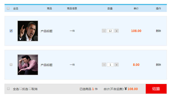jQuery添加购物车复选框是一款基于jquery制作的复选框全选反选取消,购物车,统计价格,统计,类似淘宝的购物车,非常不错的。