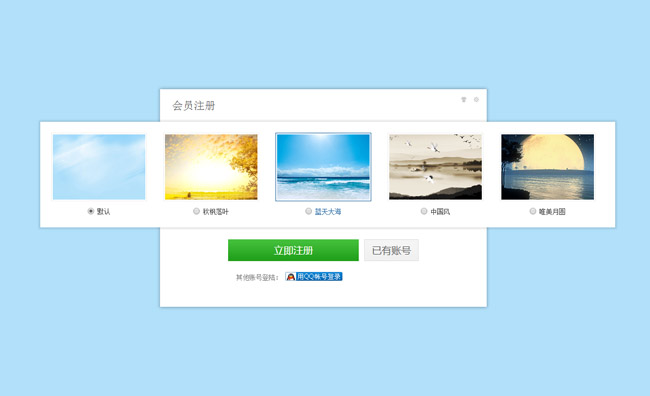 jquery可切换主题的注册表单是一款非常实用的功能,除了jquery特效,还有直接可以拿来使用的会员注册界面,可以自由控件页面的背景主题,还可以自由控制注册表单的呈现透明度,效果非常棒。