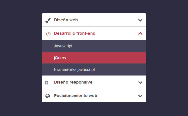 CSS3垂直手风琴折叠菜单,这款CSS3手风琴菜单的每一个菜单项都有小图标,而且只能有一项展开,更有意思的是,在菜单折叠和展开式右侧的箭头也会有不错的动画效果。