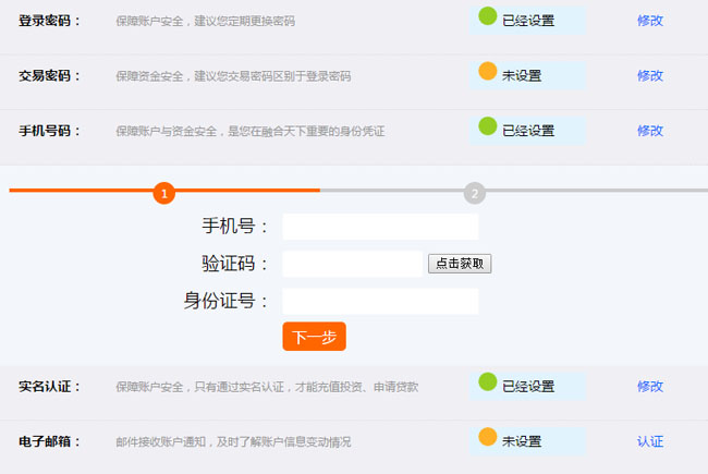 jQuery会员中心安全修改表单代码是一款登录密码,交易密码,手机号码,实名认证,电子邮箱,安全设置表单,会员表单等设置代码。