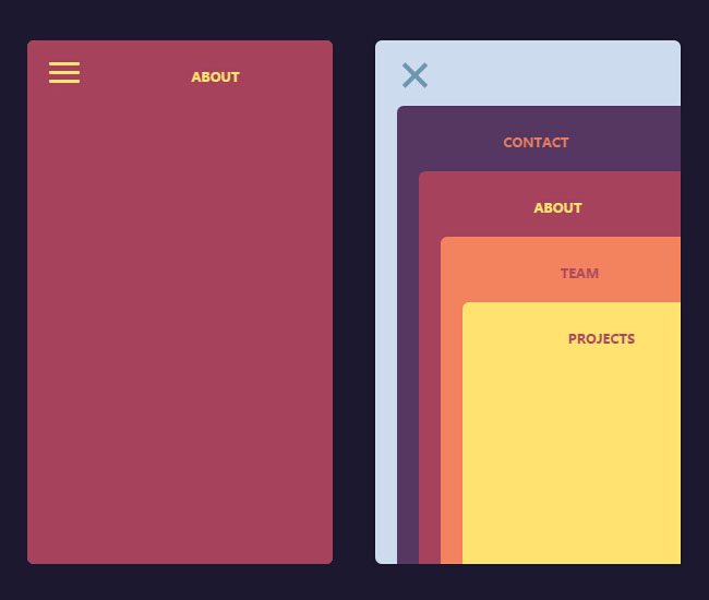 jQuery多层堆叠展示导航菜单代码是一款点击汉堡包按钮,各个子菜单会以卡片的形式堆叠排列在视口中,点击相应的子菜单就会切换到相应的页面上。