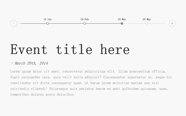 html5水平时间轴描述切换特效是一款基于jQuery和CSS3实现的水平时间轴特效插件。