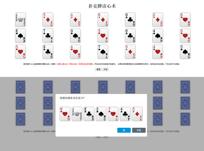 jQuery扑克牌读心术小游戏代码是一款从上面的牌库中随机记住一张牌,然后点击开始按钮开始游戏,从弹出来的牌判断您记住的牌是否在其中,在的话点击在按钮,不在点击不在按钮。