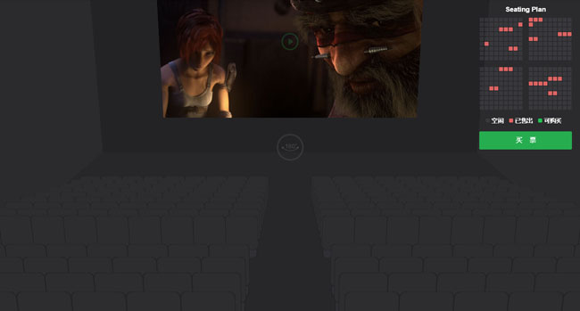 支持3D预览电影院座位预定代码是一款可以查看电影院座位情况,哪个座位是空闲的,并且可以进入某个座位实时预览在该座位上观看电影的效果。