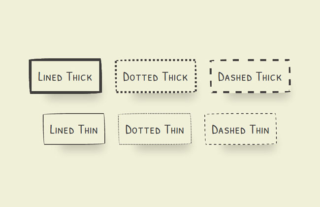 纯CSS3实现的手绘卡通按钮特效是一款共有6种不同的效果,它们以手绘涂鸦的方式,以不同的按钮边框线条宽度和虚线来构成按钮。