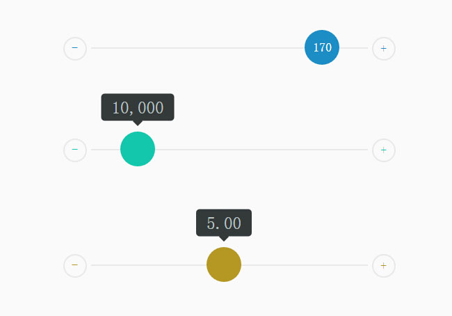 5款不同效果jQuery滑块选值特效,支持设置滑动控制柄颜色,大范围值,小范围值,默认值,步长等参数。