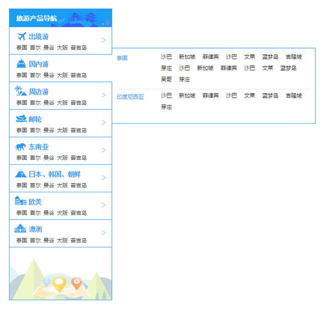 jQuery旅游网站左侧分类菜单代码是一款蓝色样式风格的在线旅游网站导航菜单特效。