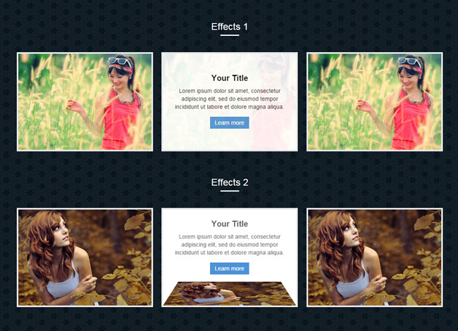 8款CSS3鼠标滑过图片动画效果是一款共分为8组不同的效果,它们分别在鼠标滑过图片时,以不同的方式显示遮罩层和图片标题。每一组效果又分为3种不同的鼠标滑过图片效果。