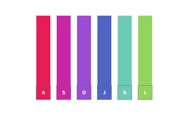 js键盘控制6键弹钢琴特效是一款仿6键钢琴动画,由于键盘不同,所以支持同时按下键的数量也会不同。
