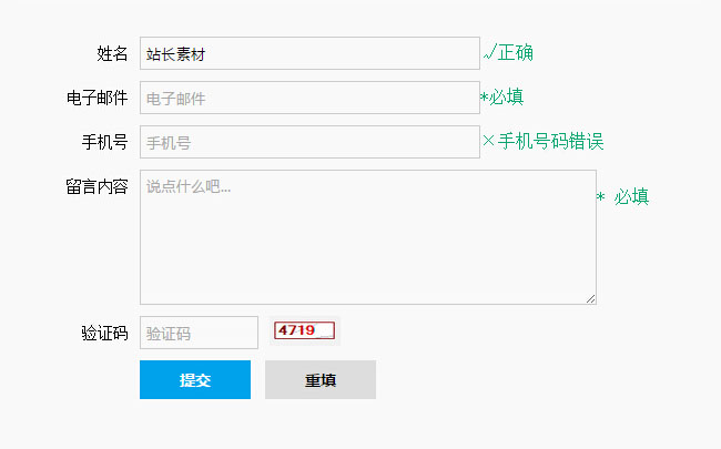 原生js带提示留言表单验证代码是一款支持姓名验证,电子邮箱验证,手机号码验证,文本验证,验证码验证等表单代码。