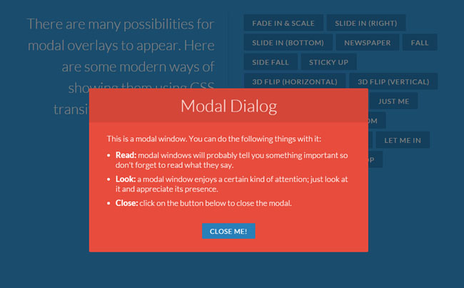 jQuery+CSS3过渡动画模态窗口特效是一款基于Codrops的ModalWindowEffects来制作,通过jQuery插件的方式来统一管理各种打开模态窗口的效果。