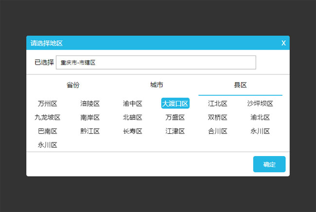 jQuery手机端省市区三级联动代码是一款经过美化的弹出层城市三级联动特效。