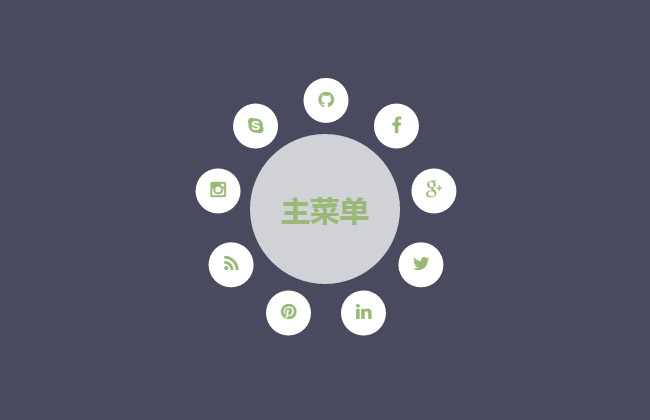 纯CSS3圆形主菜单展开特效是一款在鼠标经过的时候,所有的子菜单会依次出现,并以动画的方式环绕在圆形主菜单周围。
