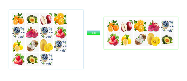 jQuery水果图片重复筛选去除代码是一款采用数组去重的方法过滤重复的水果图片效果代码。