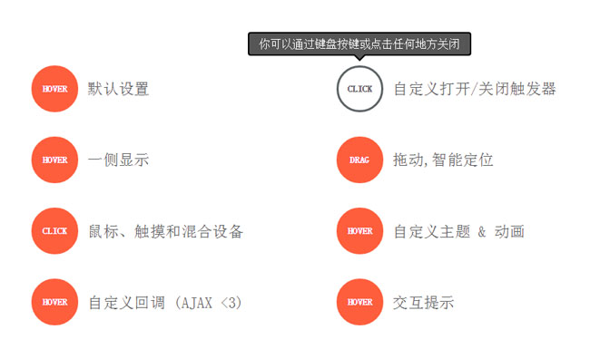 jQuery tooltipster提示框代码,默认设置,自定义打开关闭触发器。