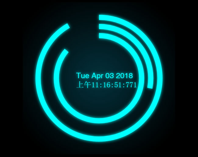 HTML5个性圆弧时钟动画特效是一款html5基于canvas绘制酷炫发光的圆弧线条走动时钟动画特效。