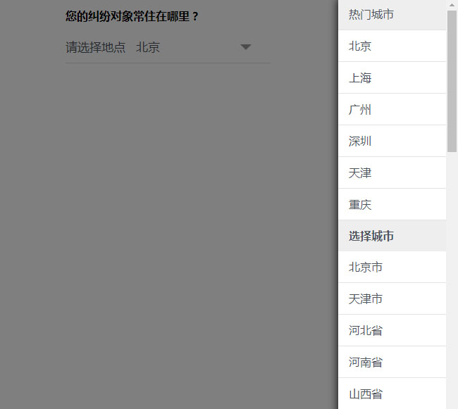jQuery右侧弹出省市城市选择代码是一款适用于手机端省市城市选择代码,点击遮罩弹出侧边栏城市二级联动菜单选择效果。
