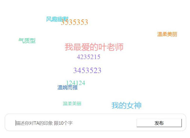 jQuery输入文字弹幕显示动画特效是一款输入描述你对TA的印象,限10个文字发布弹幕动画特效。