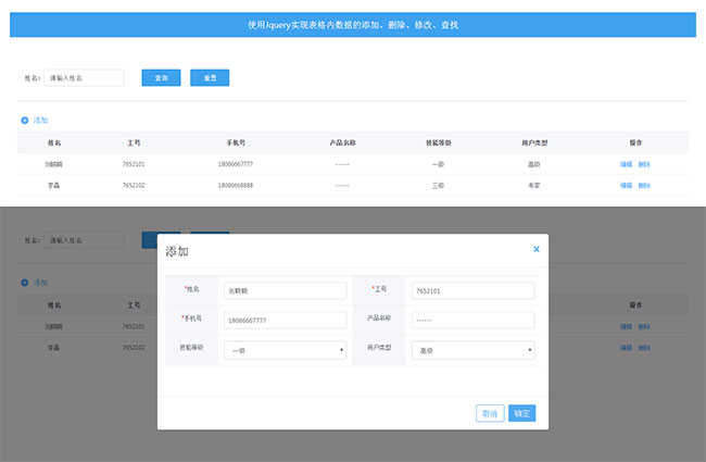 jQuery表格数据添加删除修改代码是一款jQuery基于Bootstrap.js制作的动态表格数据添加编辑删除带关键词检索功能。