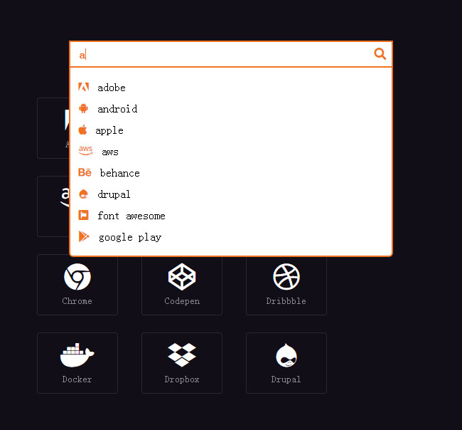 HTML5图标分类下拉搜索框代码是一款简单实用的文字下拉搜索框特效。