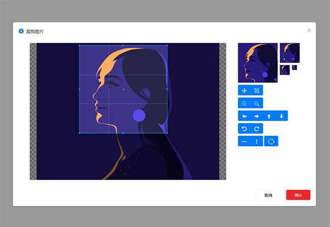 jQuery头像裁剪尺寸插件是一款图片裁剪插件,支持移动图像,裁剪图片,放大缩小图片,上下左右移动,图片翻转等重置设置功能。