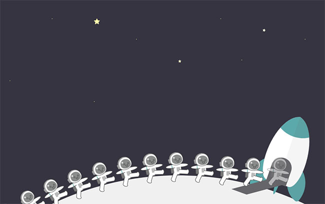 HTML5宇航员走进飞船动画特效是一款星空下一排整齐宇航员迈着大步进入宇宙飞船的动画场景。