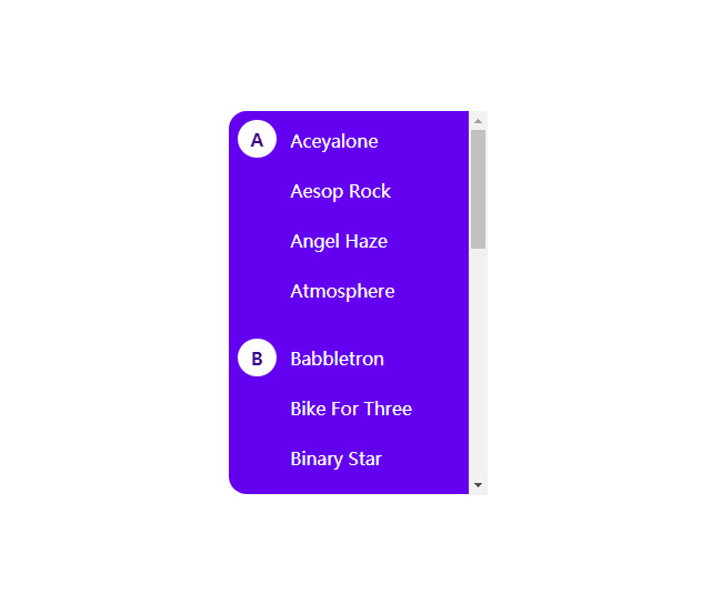 首字母索引侧边栏CSS3特效是一款基于js跟css3实现的简单首字母索引侧边栏滚动显示特效。