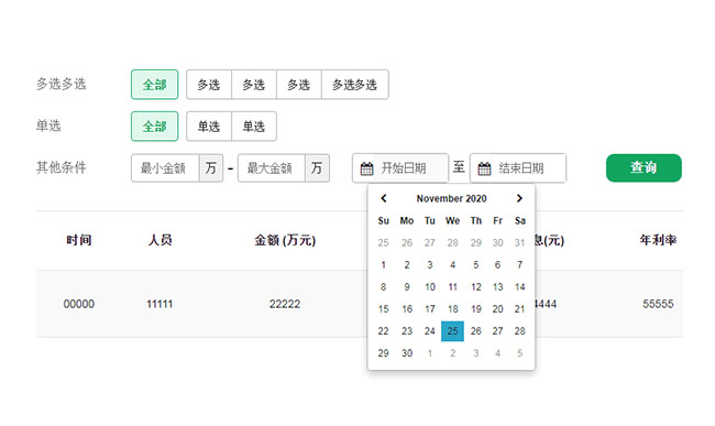 jQuery金融分类筛选查询代码是一款分类条件多选或单选,金额范围和日期范围筛选查询功能代码。
